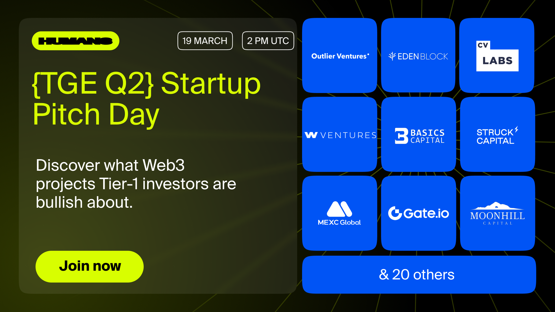 HUMANS 是一个帮助需要融资的公司开展募资活动的路演平台,本周将举办一场针对 Web3 创始人和投资者的线上活动——{TGE Q2} 创业公司路演日。