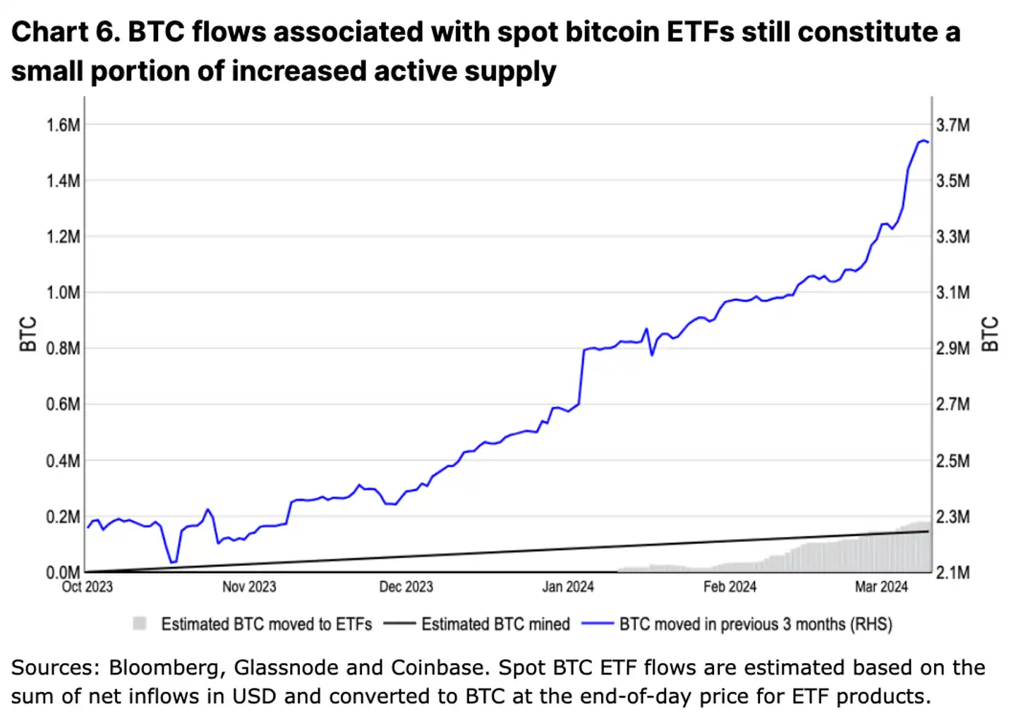 即使比特币已被纳入 ETF,然而活跃流通供应量(我们将其定义为过去 3 个月内发生过转移的比特币)的增长速度也大大超过了 ETF 累计流入量(见图 6)。自 23 年第四季度开始,活跃的 BTC 供应量增加了 130 万,而新开采的比特币只有大约 15 万。