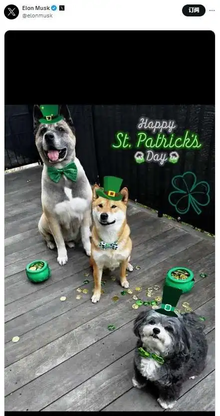 3 月 18 日,马斯克今日凌晨于社交平台发布帽子狗图片,以庆祝圣帕特里克节。受此影响,相关模因币 WIF 上涨近 20%,现报价 2.9845 美元。注:圣帕特里克节(St. Patrick's Day)为每年的 3 月 17 日,是为了纪念爱尔兰守护者圣帕特里克。如今,圣帕特里克节已经渐渐在一些国家成为节日。美国从 1737 年 3 月 17 日开始庆祝。圣帕特里克节的传统颜色为绿色。