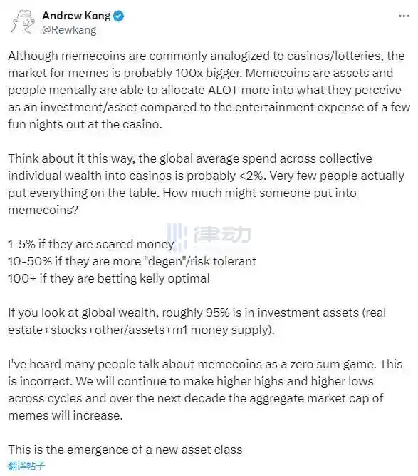 3 月 18 日,加密风险投资公司 Mechanism Capital 联合创始人兼合伙人 Andrew Kang 发文称,很多人将模因币比作彩票,但「模因币是资产,且市场规模可能比博彩业要大 100 倍。」还有人将模因币看作零和游戏,这是不正确的,「市场将继续在各个周期创造更高的高点和更高的低点,在未来十年中,模因币总市值将会增加。这是一种新资产类别的出现。」