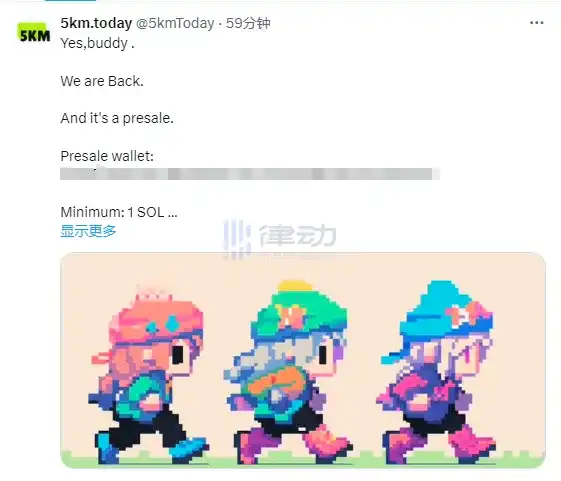 但同时也涌现出很多此前 RUG PULL 的项目死灰复燃。以 Stepn 仿盘 5km 为例,该项目于上个周期在 Stepn 爆火后推出,运营不到一年时间即 RUG PULL,项目随即停摆。其官方社交媒体长达一年时间未更新后,于今日释出 Solana 地址(目前已经删除)。