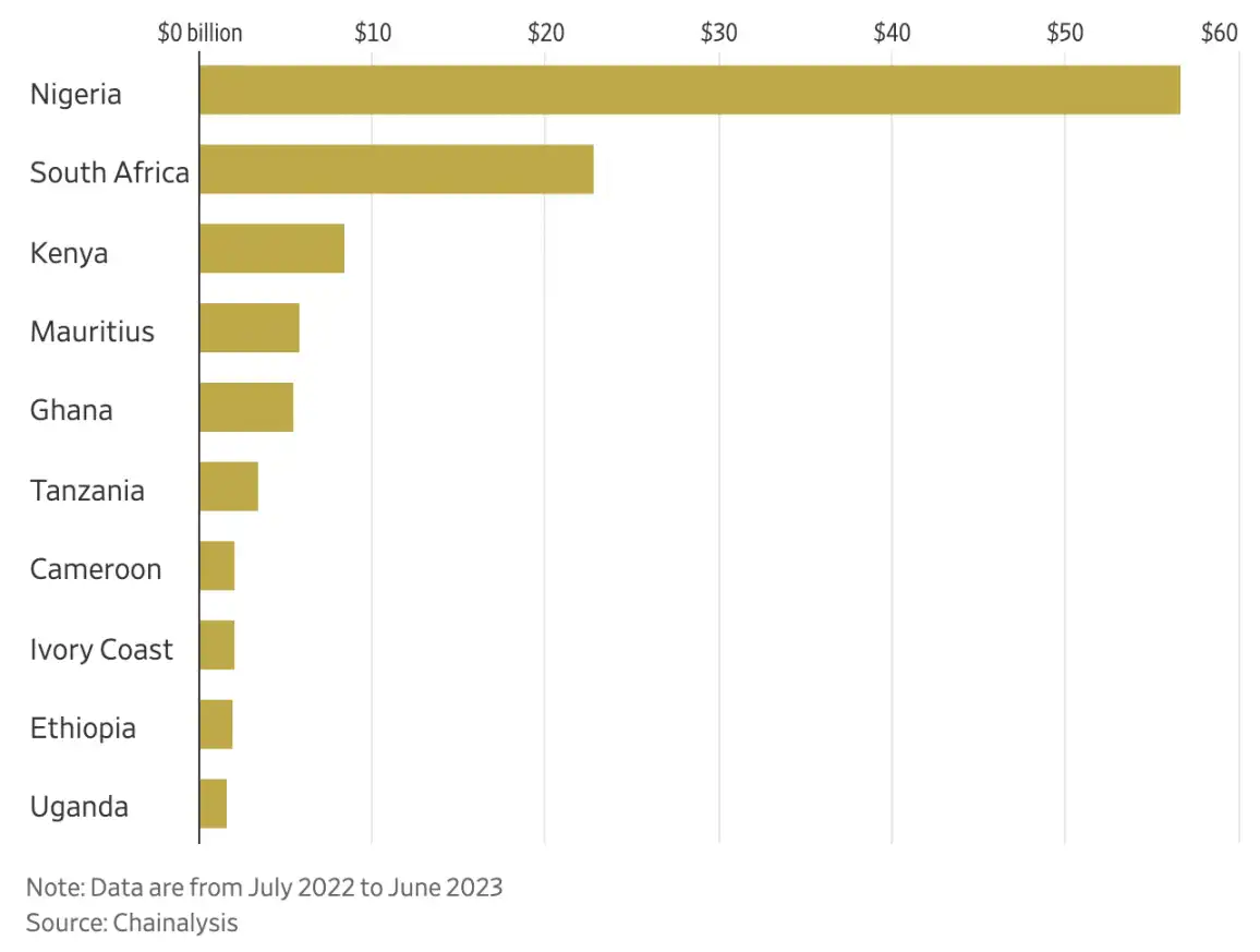 根据 Chainaanalysis 编制的指数,该国的加密货币采用率位居世界第二,仅次于印度。据 Chainalysis 称,截至 2023 年 6 月的 12 个月内,尼日利亚人接收到价值约 600 亿美元的加密货币交易。