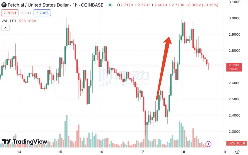 Fetch.ai(FET)24 小时涨幅 23%;现报价为 2.7 美元。