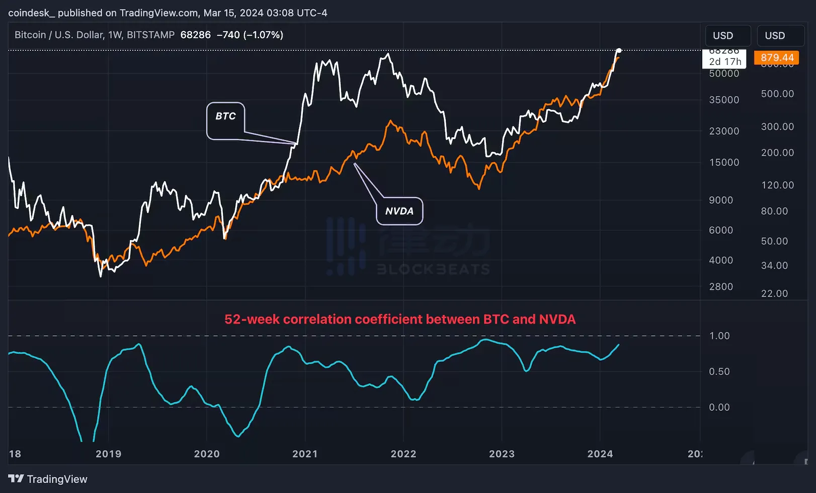 不只是 AI 板块,作为芯片巨头,英伟达对 Web3 的影响一直很深。CoinDesk 曾在 3 月 15 日报道,比特币与英伟达股价之间的 90 天相关系数已升至 0.86,为 2023 年 5 月以来的最高水平,并在 11 月份转为正值。自 2020 年 7 月以来,52 周相关性一直为正,目前已升至 0.88,为 2023 年 1 月以来的最高水平。