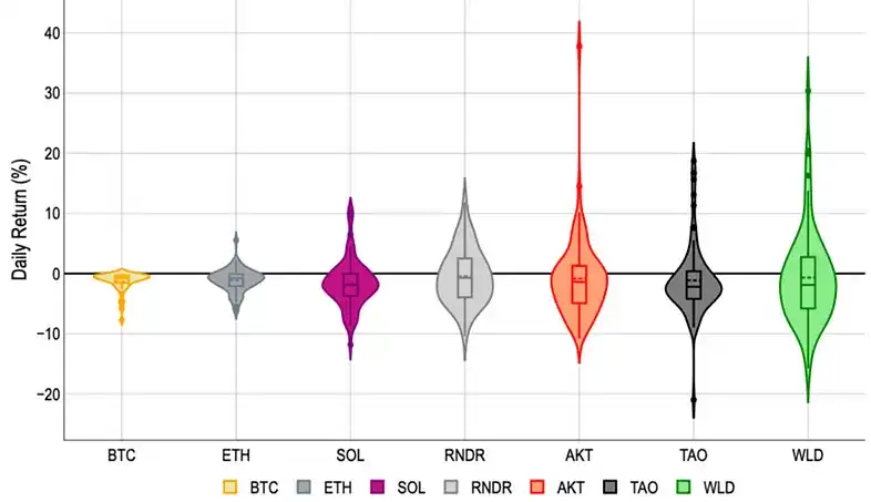 尽管存在上述难点,但从 2023 年第四季度开始,许多人工智能代币的表现优于比特币和以太币,也优于英伟达和微软等主要人工智能股票。这是因为人工智能代币通常受益于更广泛的加密市场以及相关人工智能新闻头条的强劲相关表现(参见附录 2)。因此,即使比特币价格下跌,以人工智能为中心的代币价格也可能上涨波动,这会导致比特币下跌期间出现上行波动。图 5 直观地显示了 AI 代币在比特币交易下跌期间的分散情况。