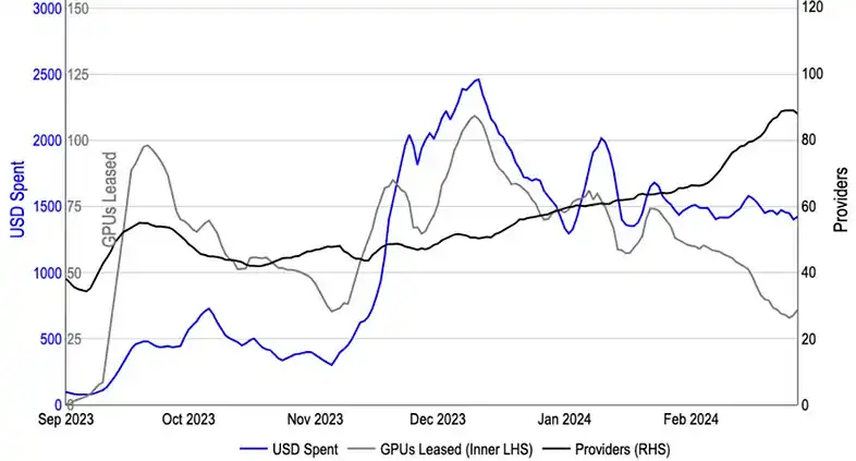 然而,自 2023 年 12 月的峰值以来,支付给网络的费用实际上有所下降,因为可用 GPU 的供应超过了这些资源的需求增长。也就是说,随着越来越多的提供商加入网络,租赁的 GPU 数量(按比例来看,这似乎是最大的收入驱动因素)已经下降(参见图 4)。对于计算定价可以根据供需变化而变化的网络,尚不清楚如果供应方的增长超过需求方的增长,最终会在哪里出现对原生代币的持续的、使用驱动的需求。尽管此类变化的长期影响尚不明确,未来可能需要重新审视此类代币经济模型,以针对市场变化进行优化。