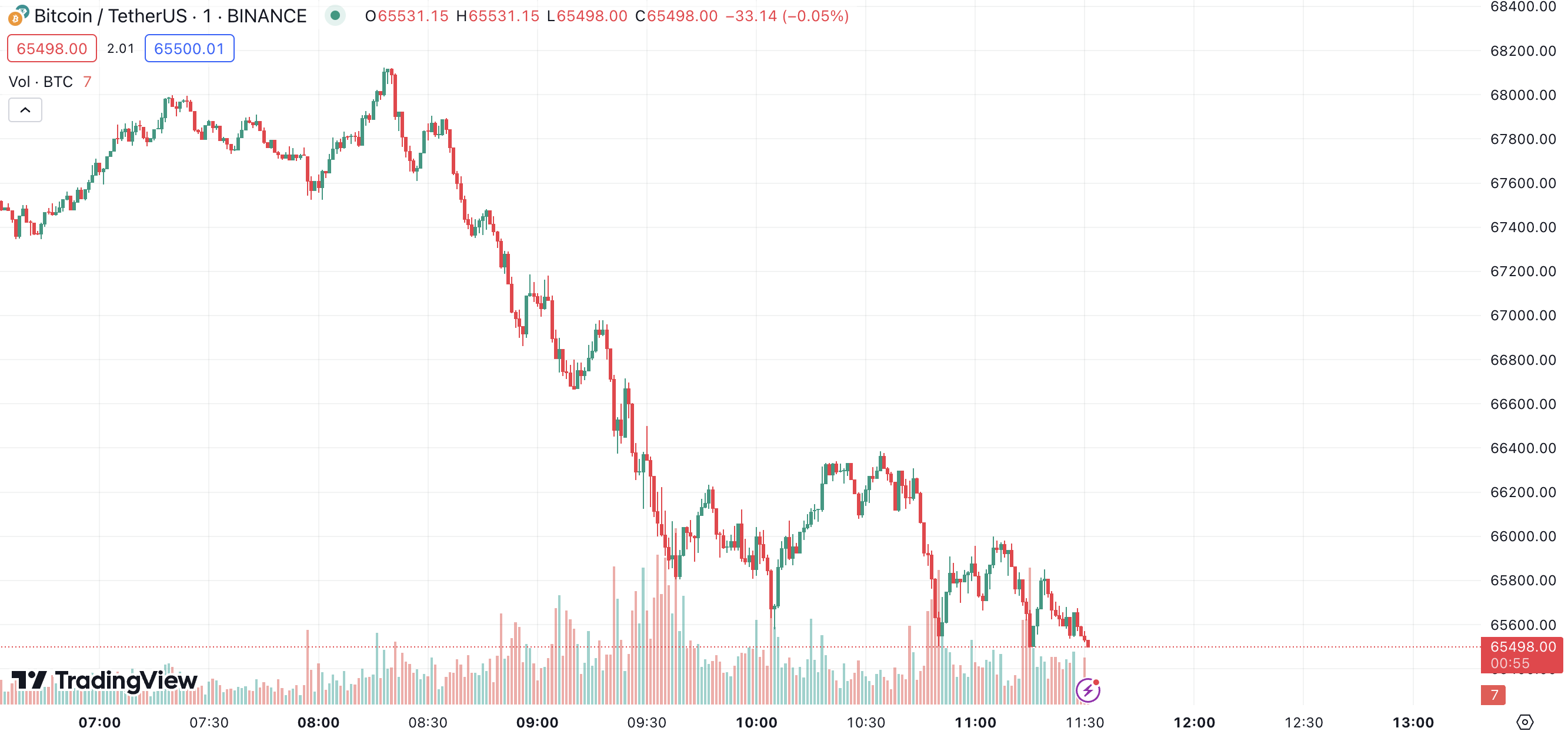近几日,大盘一直震荡,今日 BTC 跌破 65,500 美元,3 月 17 日,最低跌至 64,500 美元附近。