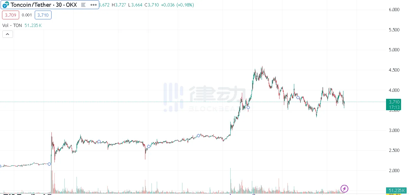 除了使用场景增加,Binance 还在 3 月 1 日上线了 TON 的合约,这无疑也助益 TON 的价格抬升甚至翻倍,截至撰稿时,TON 价格为 3.7 美元。受此影响,TON 生态的一众代币也迎来了可观的涨幅。