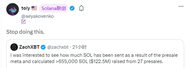昨日,Solana 联合创始人 Anatoly Yakovenko 转发了 ZachXBT 关于 Solana 链上预售项目的统计图表(27 个 Solana 链预售项目共计募资超 65.5 万 SOL),并呼吁停止向预售项目打钱。