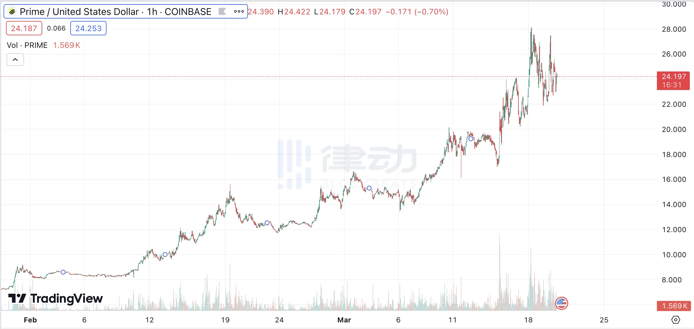 PRIME 近一个月涨幅为 118%,近几日出现了 12% 的回落跌幅,现报价 24.43 美元。