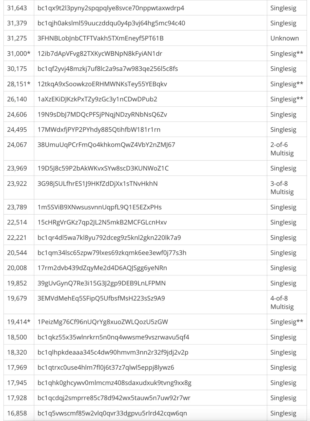 尽管很难确定比特币最富有的实体以及他们拥有的比特币数量,但确定最富有的比特币地址却很容易。有几个网站实时跟踪这些地址,这些地址的特征可以提供很多有关比特币安全存储的线索。