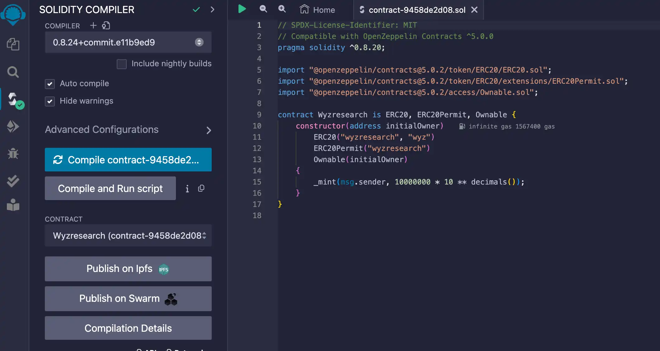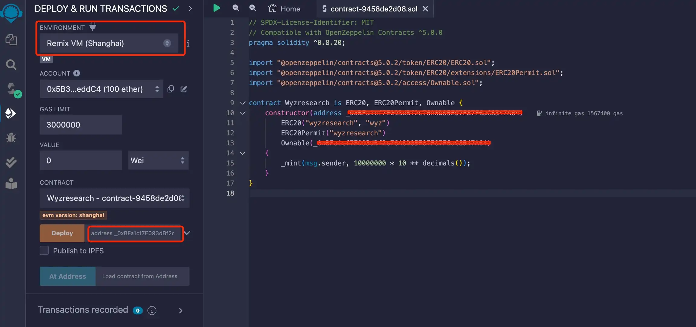 随后我对这个发行 token 的合约进行了设置,使用 Wyz Research 的全名,Wyz 的缩写,并且选择了功能里的预发行,并且对合约进行了控制所有权的指定。通过这些操作,右侧的合约代码中,多了第一个红框中显示的建造者,而预发行的代币也有了地址指向。