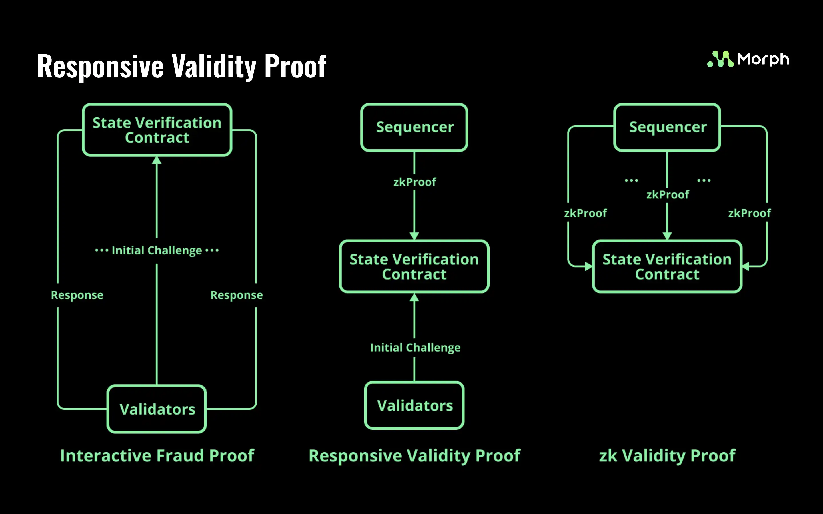 以上两种证明方式都存在不小的缺点,Morph 提出了一种新验证方法:响应式有效性证明。它将 Optimistic Rollup 与 Validity Proof 结合起来,并利用 ZK-Proof 来验证状态的正确性。