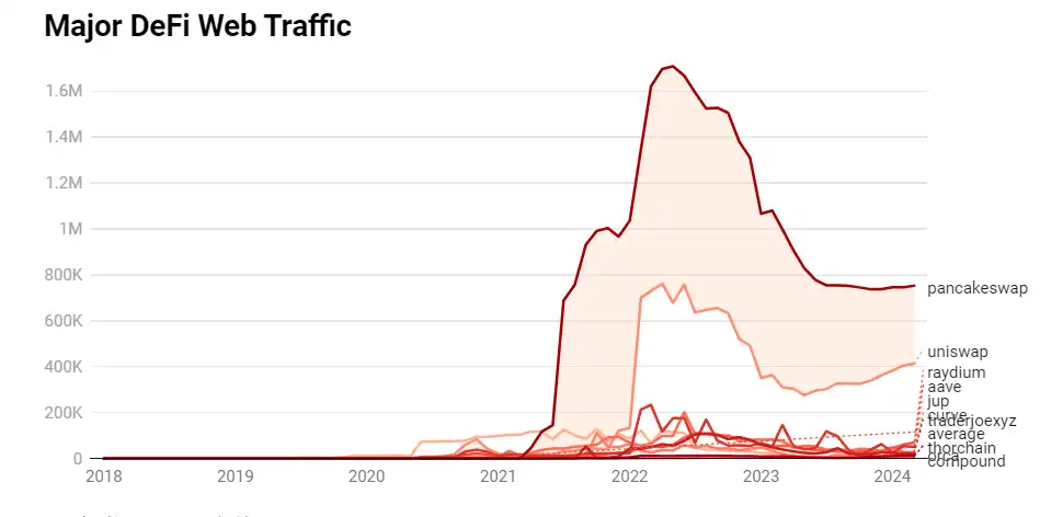 当查看主要 DeFi 项目的网络流量时,PancakeSwap 处于主导地位,其次是 Uniswap、Raydium 等。PancakeSwap 的高流量很可能是由于各种功能,包括游戏和 NFT。这些不是核心功能,但它们是吸引用户的因素,这在其他 DeFi 平台中很难找到。
