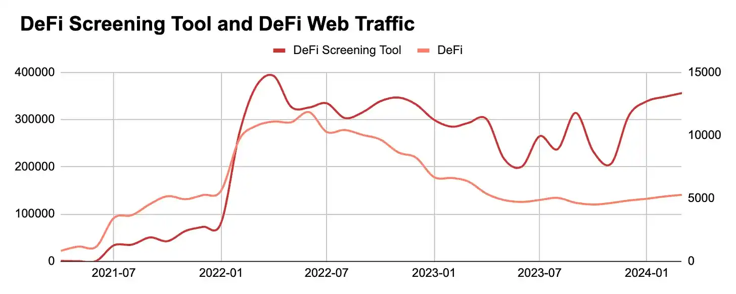 · DeFi 分析工具和 DeFi 网络流量的差异:尽管像 DEX 筛选器这样的分析工具的流量稳步增长,但传统的 DeFi 服务的网络流量相对较低。这表明投资者在做出实际交易或投资决策时更具选择性,而不是经常访问分析工具以获取市场信息。
