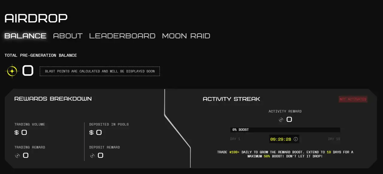 根据网页上的提示,目前的积分显示并未上线,具体的规则也尚未公布,但可以猜测得到的是,想要获得 Blitz 的积分,应该也是需要对流动性和交易量做出贡献。另外,Blitz 在 Galxe 上的活动仍然在进行中,可以通过活动获得 Blitz Community Points,具体的规则参考官方说明:https://docs.blitz.exchange/points-and-protocol-rewards/blitz-community-points