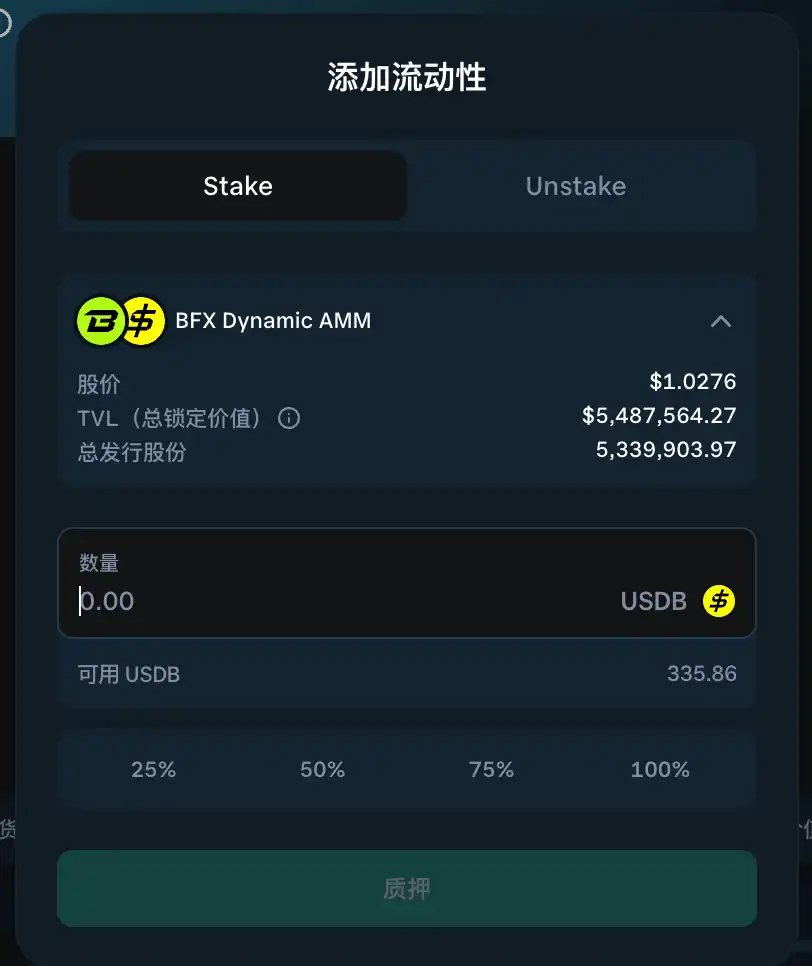 存入金库的 USDB 是作为协议的动态 AMM 资金作用的,当前的资金还有 41.46% 的年化收益,当然 BFX 的这个动态机制在市场单边行情的时候也可能有风险,用户需要知晓。