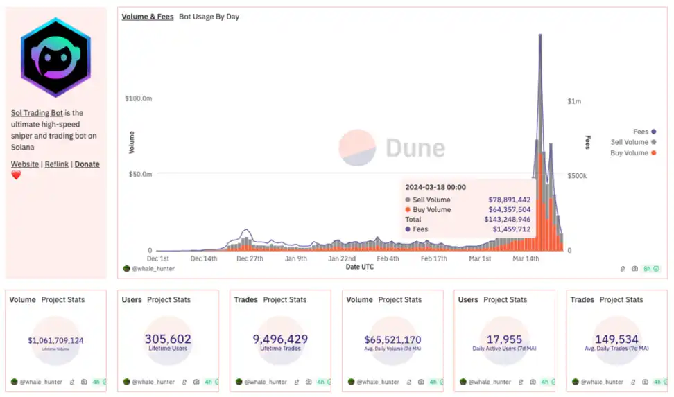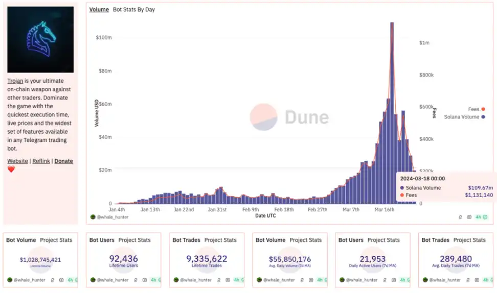 在交易数据方面,仅次于 BonkBot 是目前排名第二的机器人,在 3/18 高峰期单日交易量突破 143M 单日手续费收入突破 1.4M 美元,而目前交易量与 Trojan 旗鼓相当每日约为 20M。