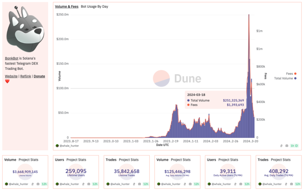 BonkBot 是由 Bonk 社区所制作的 TG 交易机器人,也是目前 Solana TG Trading Bot 之中交易量第一的机器人,BonkBot 以其简洁的使用界面为特色,也具备抗 Mev 交易、调整 Gas Fee 等等的功能,最高峰 3/18 单日交易量突破 250M 单日手续费收入达到惊人的 1.4M 美元,而目前数据回落平均每日交易量约为 50M。