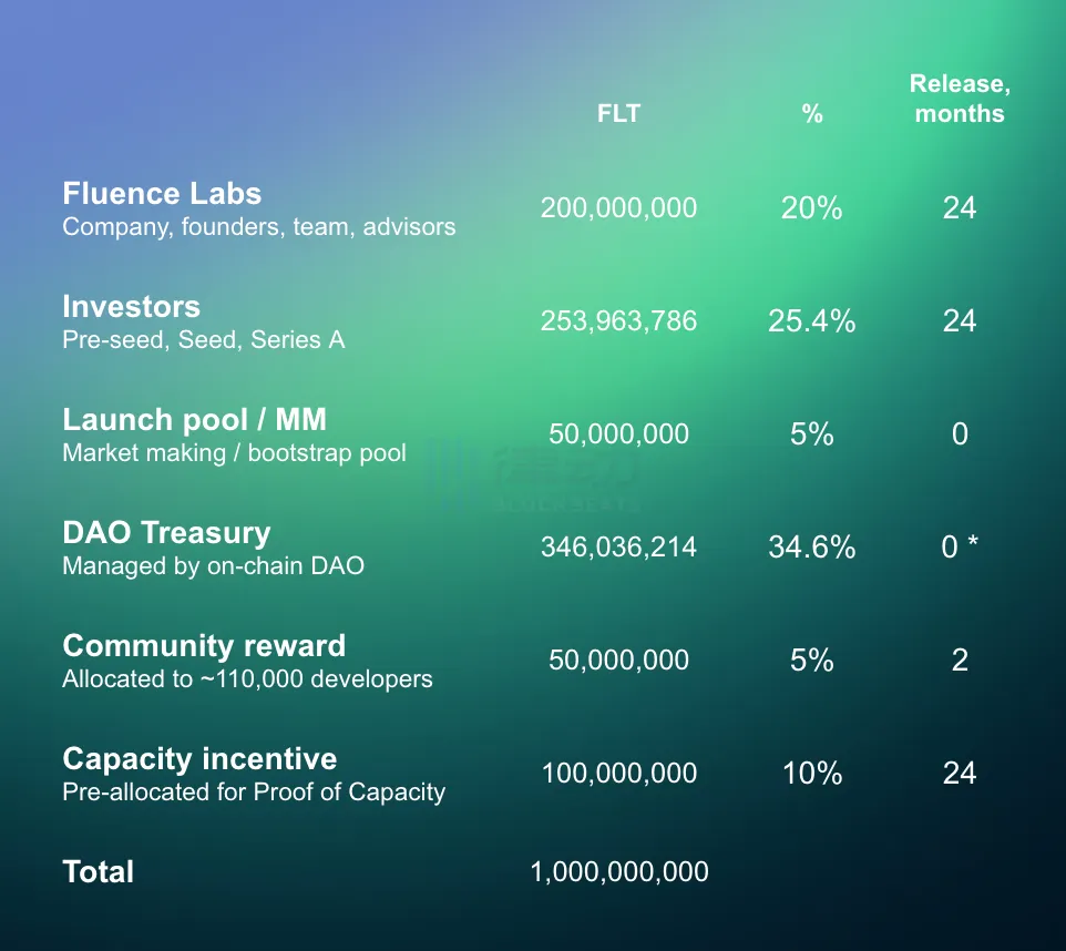 3 月 23 日,Fluence 发布了项目的代币经济学。其$FLT 的供应总量为 1,000,000,000 枚,初始流通量占 5%,被分配给 2 月 27 日开始的开发者奖励计划。代币自领取之日起锁定两个月,并于 4 月 27 日开始释放。支付给存储提供商的奖励将于 3 月 20 日主网上线后支付。这些奖励取决于添加到网络中的计算量,并锁定三个月。代币发行后 24 个月内将解锁 FLT 总供应量的约 45%。