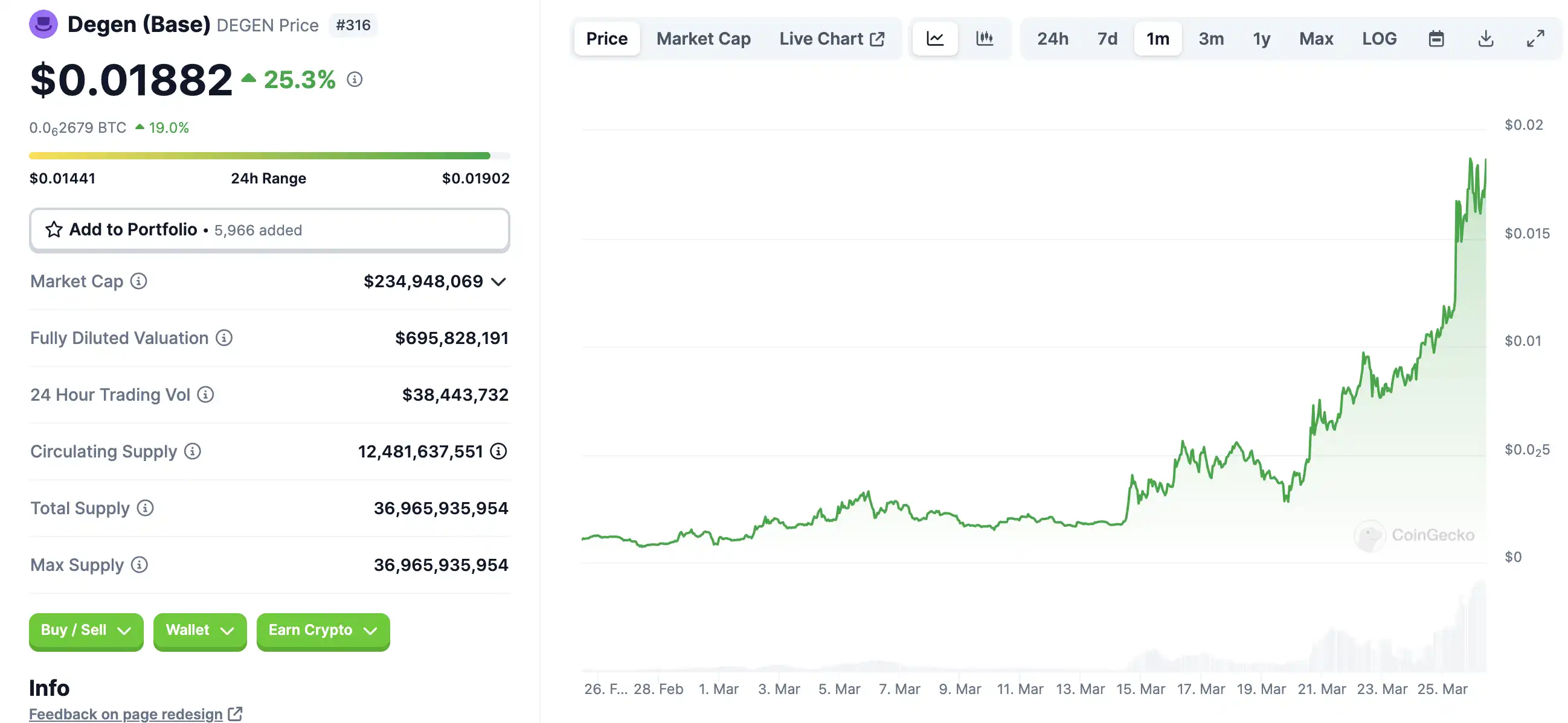 Farcaster 协议上的 meme 币 DEGEN 目前价格为 0.018 美元,7 日涨幅达 376%。
