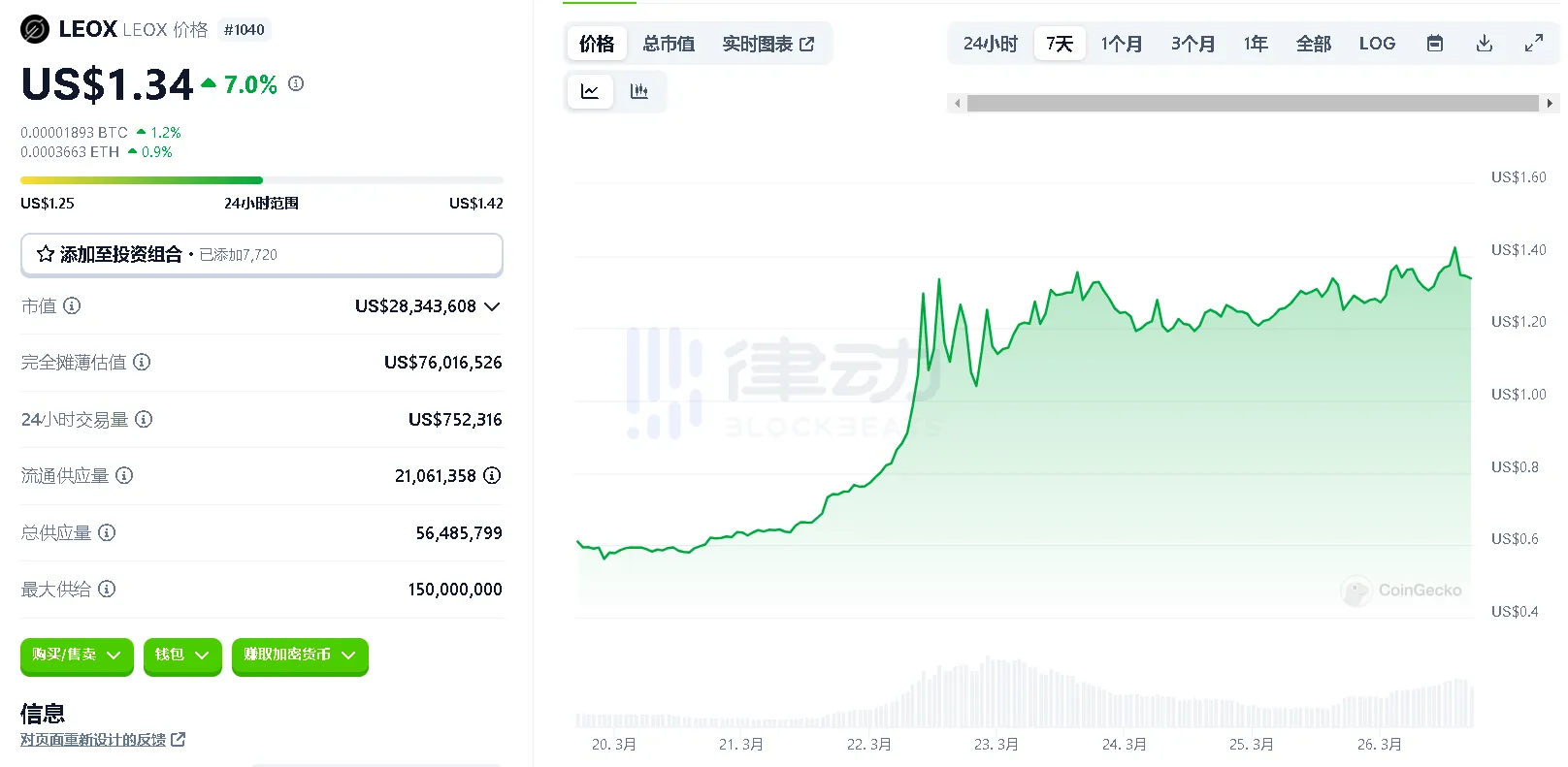 Galileo Protocol 将发行 1.5 亿个 LEOX 代币,初始流通供应量为 2890 万枚。截至撰稿时,LEOX 价格为 1.34 美元,周涨幅达 120.7%。