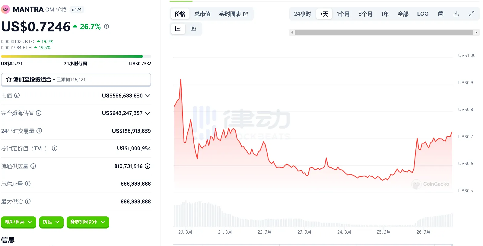新资金将用于帮助 MANTRA 实现三个关键目标:构建合规的基础设施、为开发人员提供支持以及扩大 RWA 代币化项目范围。截至撰稿时,OM 价格为 0.72 美元,24 小时涨幅达 26.7%。