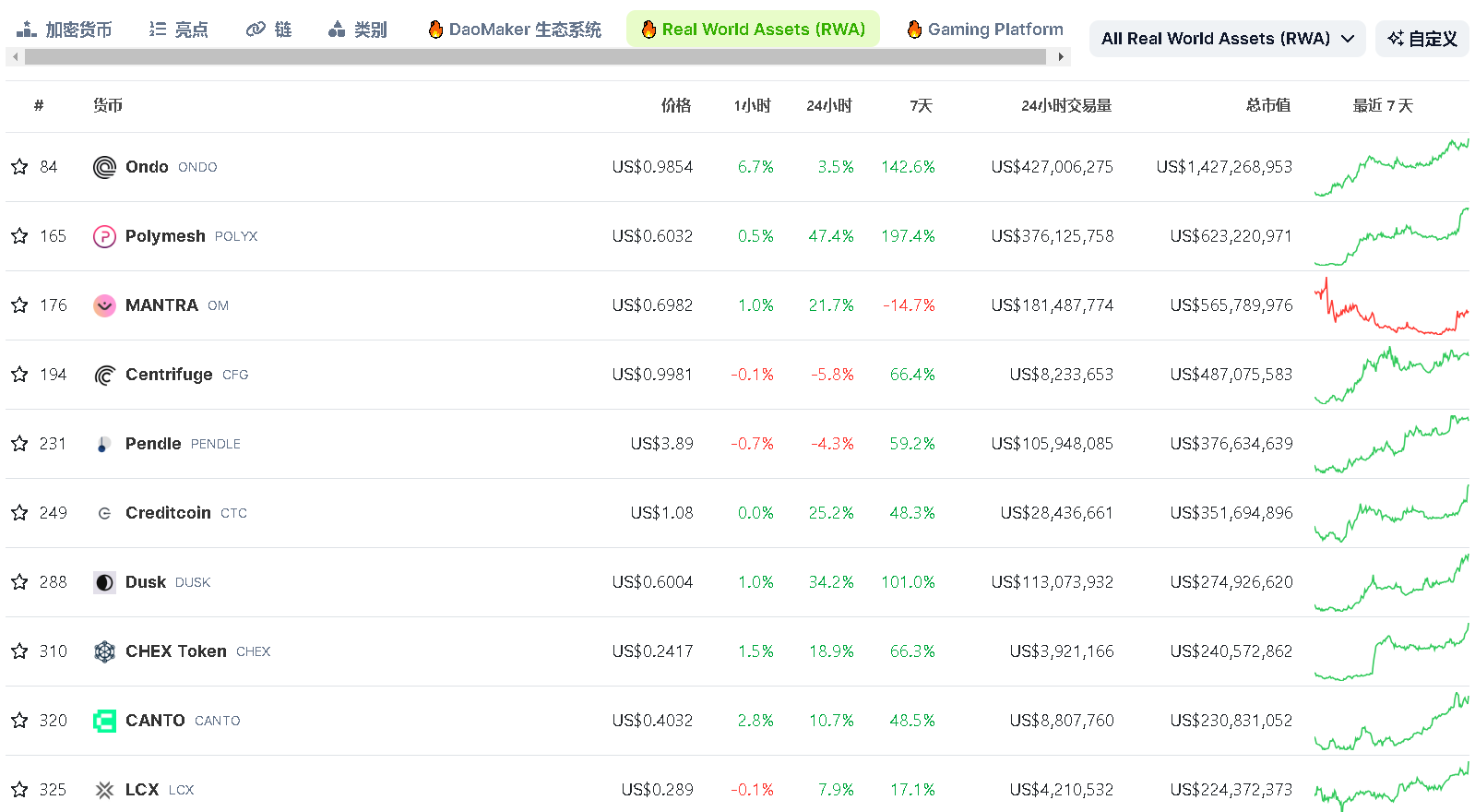 其中 POLYX(Polymesh)一周涨幅达 197.4;TOKEN(TokenFi)一周涨幅达 210.5;NXRA(AllianceBlock Nexera)一周涨幅达 129%;GFI(Goldfinch)24 小时涨幅达 97.3%;RIO(Realio Network)一周涨幅达 141.7%。