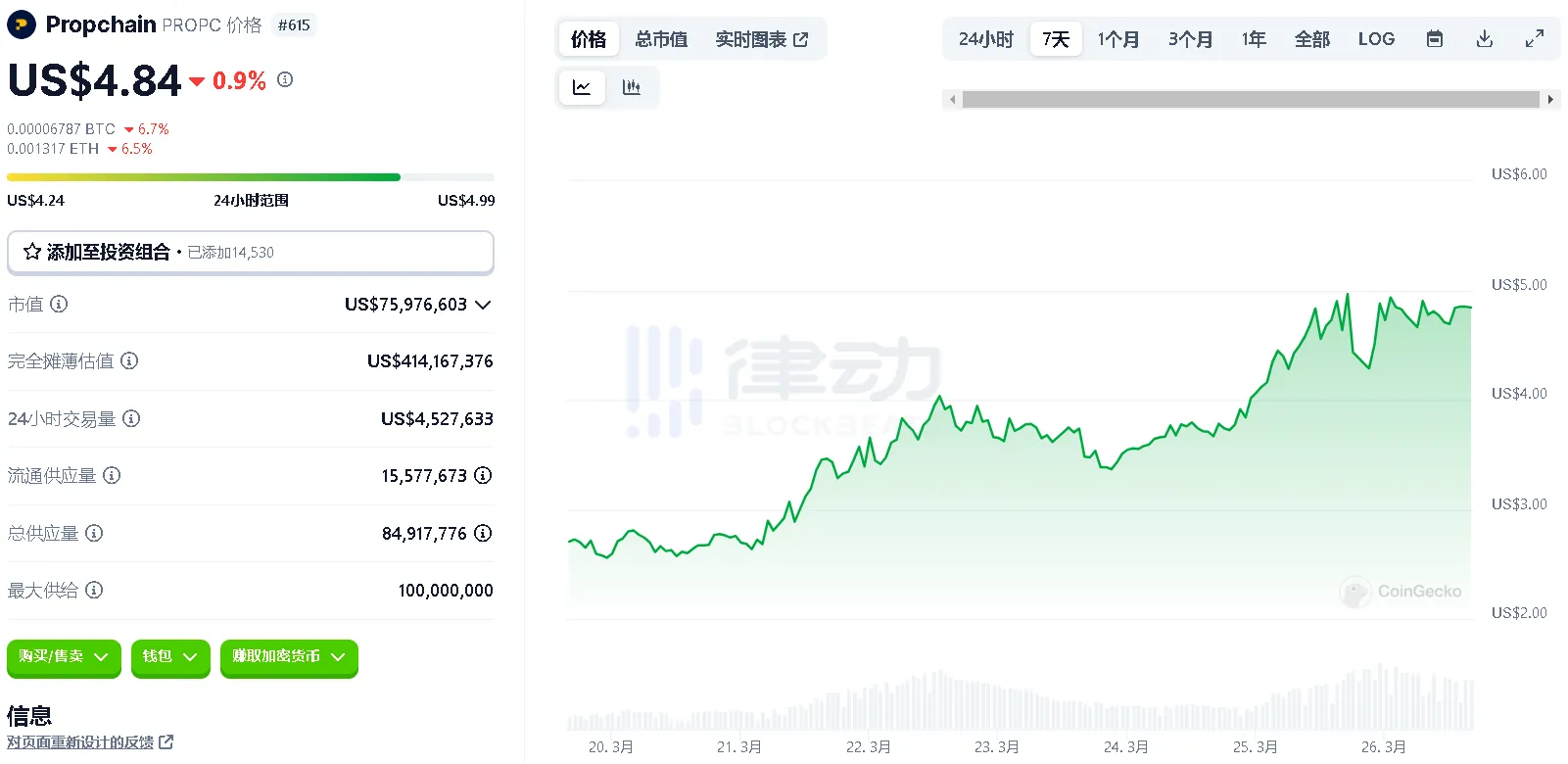 Propchain 允许投资者的投资门槛低至 1000 欧元。所有房产均由 Propchain 的物业管理团队团里,投资者只需从房产中收取租金即可。截至撰稿时,PROPC 价格为 4.84 美元,周涨幅达 83.4%。