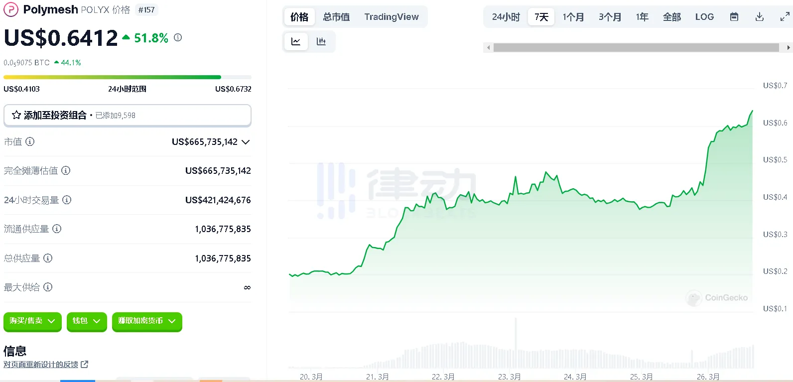 Polymesh 原生代币 $POLYX 层被瑞士法律归类为实用型代币。去年 4 月,Binance 曾宣布成为 Polymesh 的节点运营商,彼时 POLYX 应声上涨超 10%。目前,POLYX 同样呈现上涨趋势,截至撰稿时,POLYX 价格为 0.64 美元,周涨幅达 219.1%。