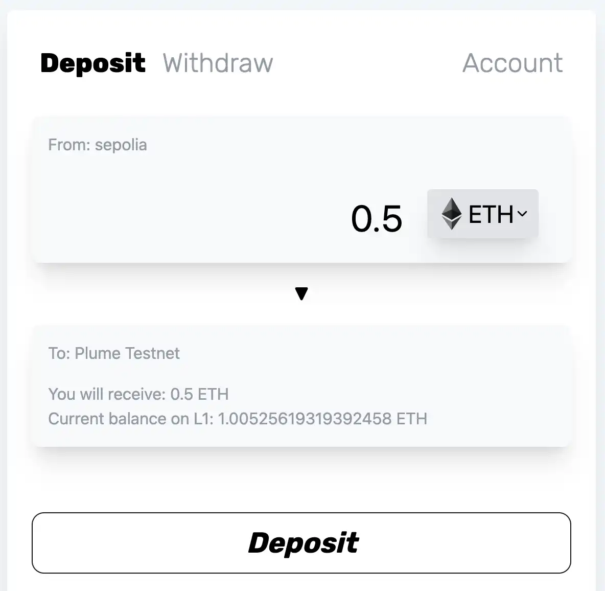 最后,使用Plume 测试网桥将 SepoliaETH 桥接到 Plume 上。