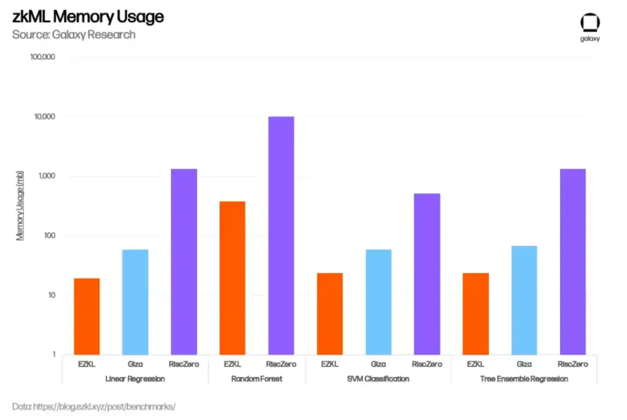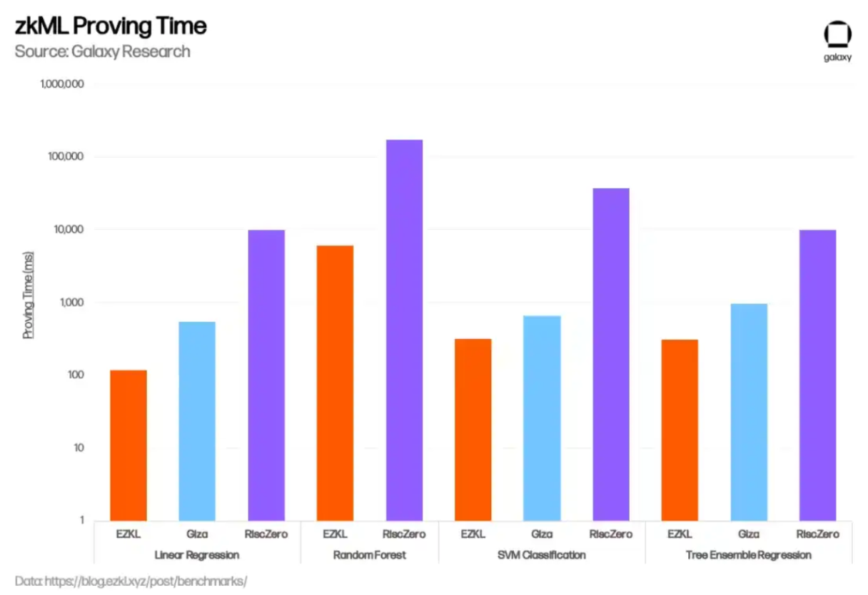 如上,ZkML 的基础设施部分分为了以 Modulus Labs 为代表的链上 ML,以及 Giza、EZKL 为代表的可信推断证明服务,此外还包括以 Risc Zero 和 Axiom 为代表的协处理器。这个赛道目前还比较早期,需要考量其技术能力与团队背景。