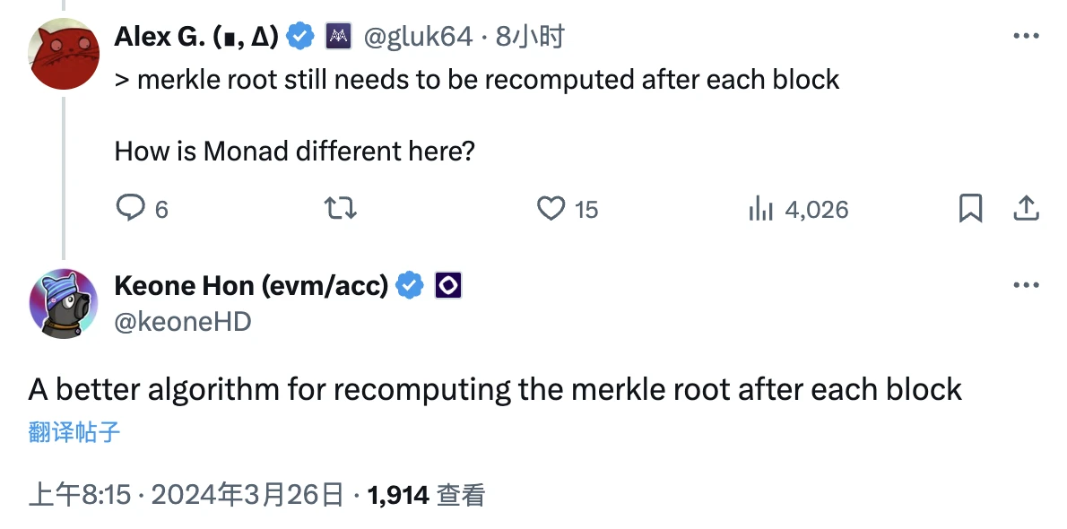zkSync 联合创始人 Alex Gluchowski 针对文中「每个区块之后都需要重新计算 merkle root」的内容询问 Monad 在这方面有何不同?」