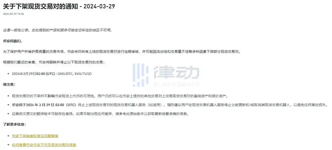 3 月 27 日,据官方公告,Binance 根据近期审查结果,决定将于 3 月 29 日 3:00 (UTC) 下架 GNS/BTC 和 XVG/TUSD 现货交易对。