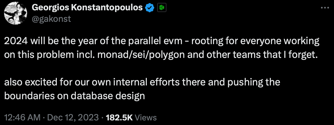 社区开始关注 Parallel EVM(EVM 并行化)起源于 Georgios Konstantopoulos(Paradigm 的 CTO)和 Dragonfly 的 Haseeb Qureshi 不约而同在 2023 年底展望 2024 年趋势时,提到的这同一个关键词。但讨论这个话题的细节并不多,而且也有很多人认为这并不是什么新概念,EVM 和并行化计算分别都是相对成熟的概念了,为什么把这两个词结合在一起就是个重要的趋势呢?