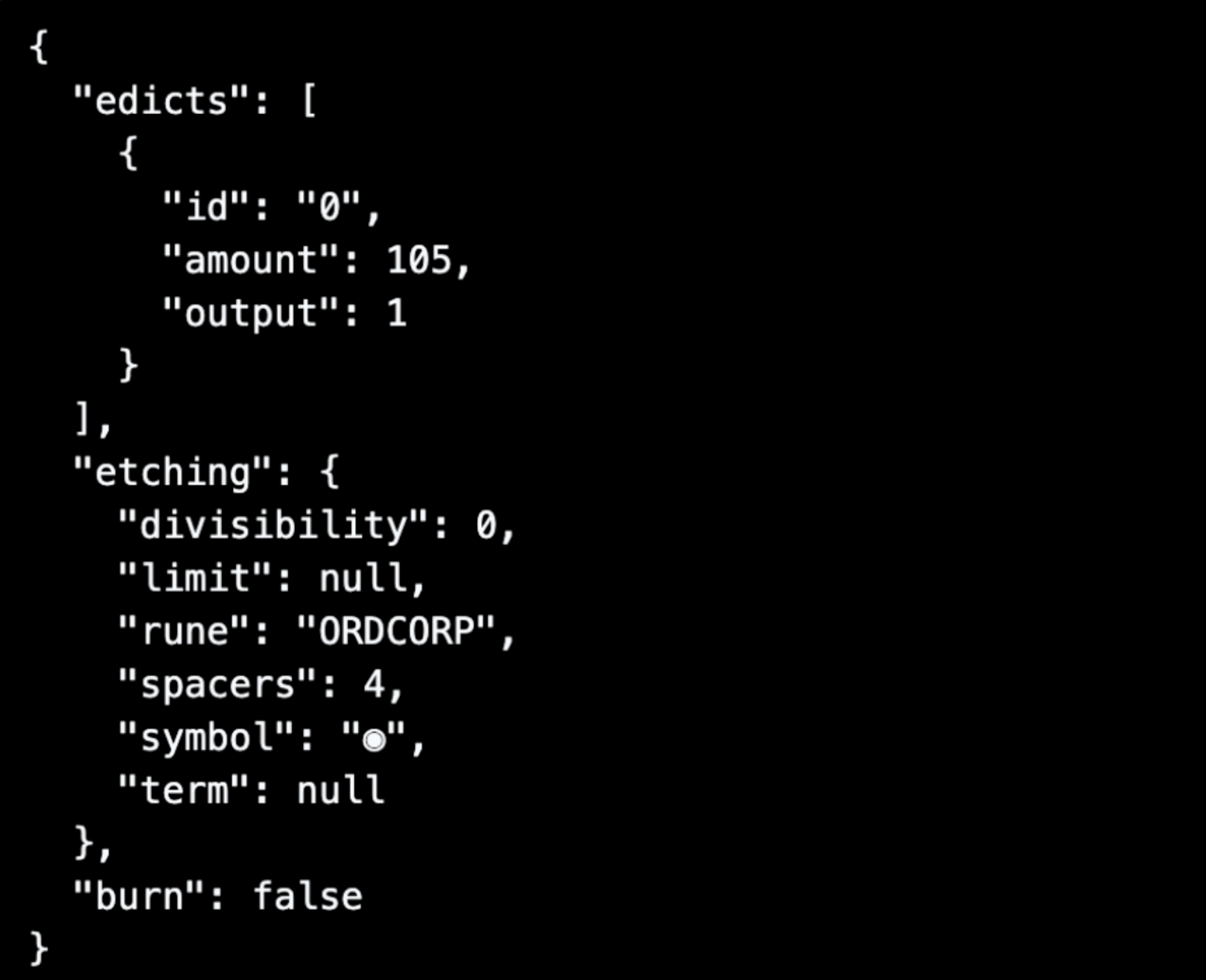 如果协议消息后还有第二个数据输出,该交易则为一笔 Runes 代币创建交易。这部分的数据输出将被解码为 SYMBOL 和 DECIMALS 两个整数,如果还有更多其它整数则无效。SYMBOL 相当于 BRC-20 的 Ticker,也就是代币名称,最多支持 26 位,可用字符只有 A-Z。DECIMALS :精度,决定 Runes 代币能支持小数点后多少位。如果 SYMBOL 还未被使用,该 Runes 代币将被分配一个 ID 值,第一个被创建的「符文」Token ID 值为 1,BITCOIN 、 BTC 和 XBT 这 3 个名称被禁用,同时在 Runes 协议依然不支持创建同名 Token。