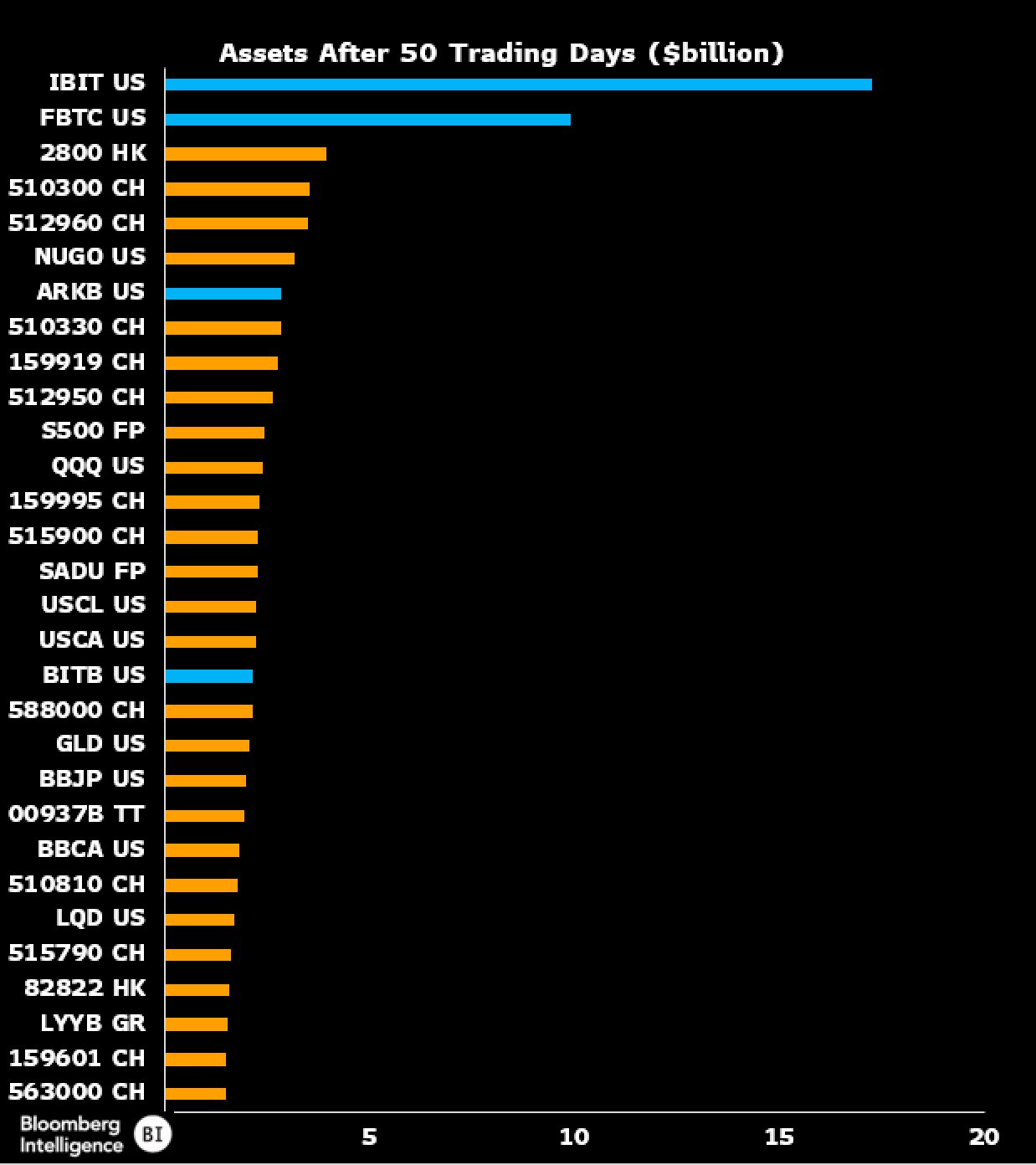3月26日,彭博社高级ETF分析师埃里克-巴尔丘纳斯(Eric Balchunas)在X上发表文章,指出在最大的30只资产基金前50个交易日的图表中出现了比特币ETF。