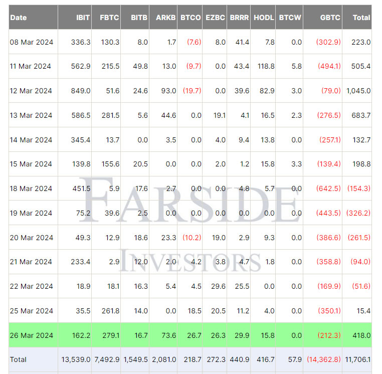 根据Farside Investors的数据,在黑岩(Blackrock)和富达(Fidelity)基金强劲流入的带动下,最近获批的10只现货比特币ETF在3月26日合计净流入4.18亿美元。