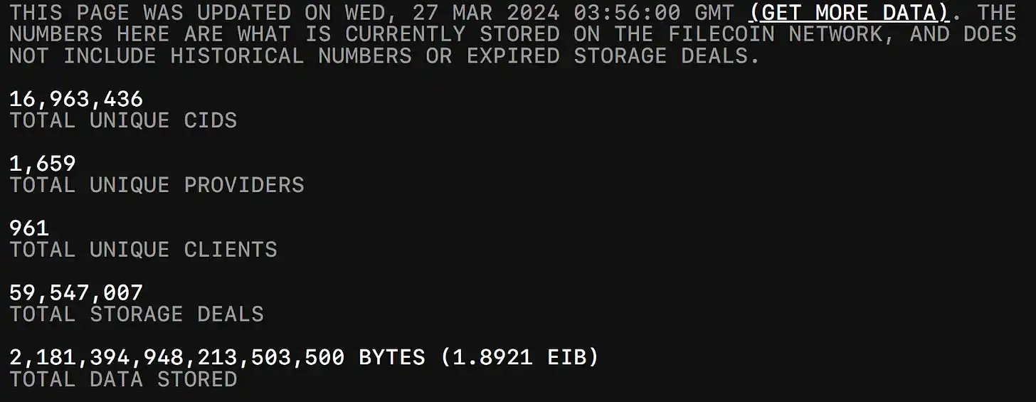 Filecoin 作为一种去中心化的存储层广为人知,允许任何人以去中心化的方式存储数据(也被称为 Web3 的 "Dropbox")。它建立在专有文件系统(IPFS)之上,激励数据存储提供商确保数据的安全存储和可检索。Filecoin 为任何想要存储文件或因存储其他用户文件而获得报酬的人提供了一个开放的市场。Filecoin 已经被用户积极使用,这是目前存储在 Filecoin 上的数据快照: