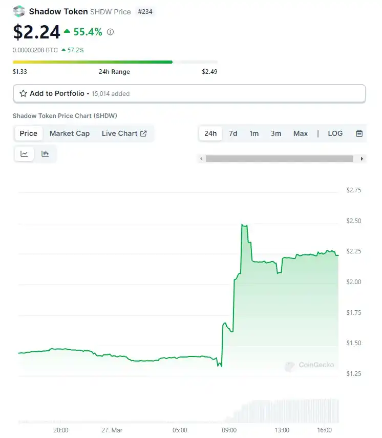 此消息一出,SHDW 美元的价格在过去 24 小时内上涨了约 55%,从 1.35 美元涨至 2.49 美元。