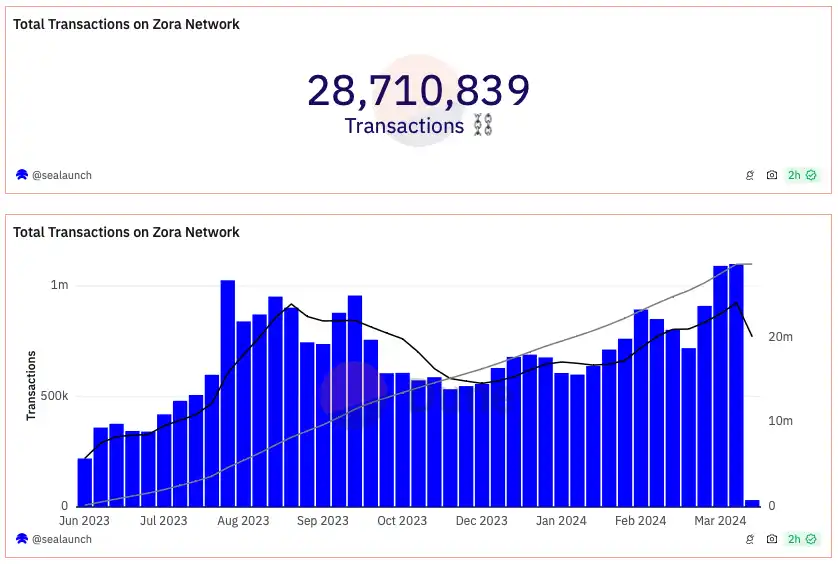 今年 2 月初,Uniswap 社区投票通过「在以太坊 L2 网络 Zora Network 上部署 Uniswap V3」温度检查投票提案。Uniswap 的到来,让 Zora 生态的「金融属性」增强不少。到了 4 月初,据 Dune 数据显示,Zora 主网桥接地址数已达 470,594 个,桥接 ETH 达 6824 枚,而网络交易次数也不断攀升,截止目前已经累计处理了近 2900 万笔交易。