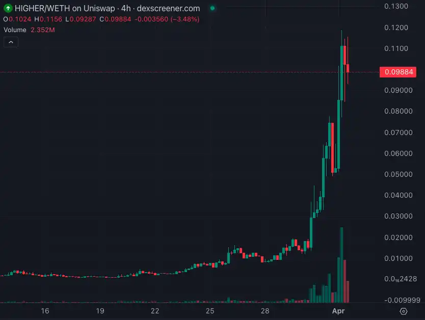 根据官方文档,HIGHER 代币的用途包括:获得 Dao 会员资格、炒作 HIGHER IP 的机会以及未来生态内潜在激励机会,持有 1 HIGHER 代币即可成为 Higher 的成员,HIGHER 社区则是去中心化的自治组织。截至目前,HIGHER 代币在过去一周已实现了 10 倍涨幅。