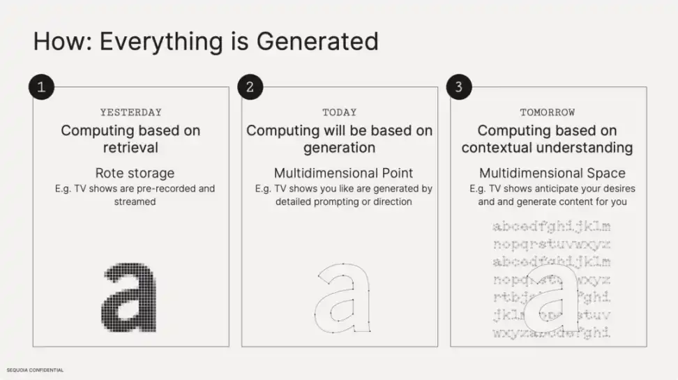 一年前 Jensen Huang 提出了一个预言,未来图像将不再是渲染出来的,而是生成出来的。这意味着我们正在从将信息存储为像素矩阵,转变为将其表示为多维概念。以字母「a」为例,过去「a」都是以 ASCII 码 97 这个原始数据被存储,但现在计算机不再只关注像素表示,而是理解字母作为英文字母在特定语境下的概念内涵。