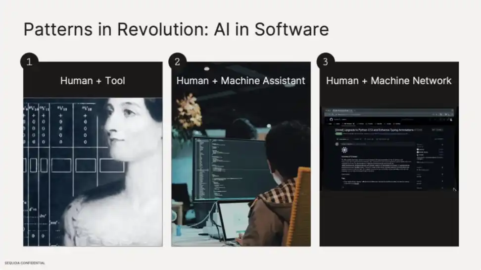 历史上的生产力革命都有相似的模式:起初是人使用工具,然后发展到人配合机器,最终转变为人类与协同化、网络化的工具协作。这表明 AI 的发展将经历从单点逐渐进化到高度集成网络的过程,这将极大改变我们的工作和生产方式。