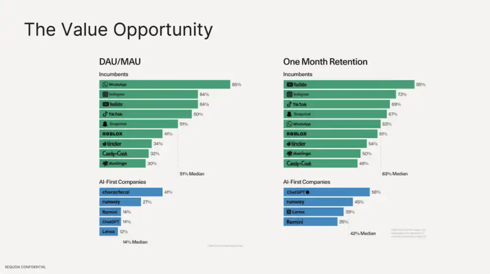 尽管 AI 产品的用户数量和收入看起来很可观,但它在 DAU、MAU 和次月留存率方面还远低于移动应用。很多用户都在用户调研中提到 AI 应用的预期与体验之间存在差距。还有一些产品 demo 看起来很炫酷,实际用起来却不怎么样,这也导致用户没有能更长期使用下去。
