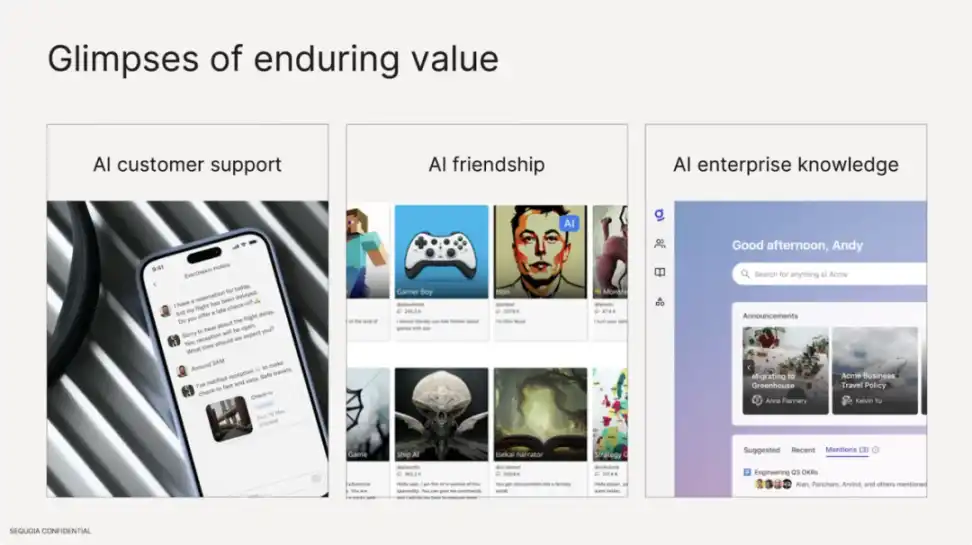 AI 的应用场景已经非常广泛,其中 AI 客户支持、AI Friendship(AI 虚拟陪伴) 和企业知识是非常典型的三个领域。客服是第一批在企业中真正实现产品 PMF 的 AI 应用场景之一。Klarna 不是一个例外,而是一个普遍趋势。AI friendship 是 AI 最令人惊喜的应用场景之一,它的用户数量和使用指标表明,用户对此有着强烈的喜爱。此外,跨部门、跨职能的企业内部知识共享(Horizontal enterprise knowledge)应用也有很大的潜力。