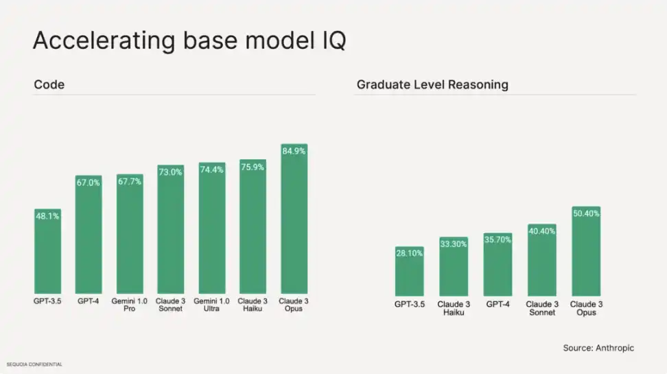 这些虽然是客观存在的问题,但更是机遇。去年企业对 GPU 的大量投资带来了更加智能的 foundation model,最近出现的 Sora、Claude-3 和 Grok 等都显示出 AI 的基准智能水平正在提高,因此未来 AI 产品的 PMF 将加速提升。