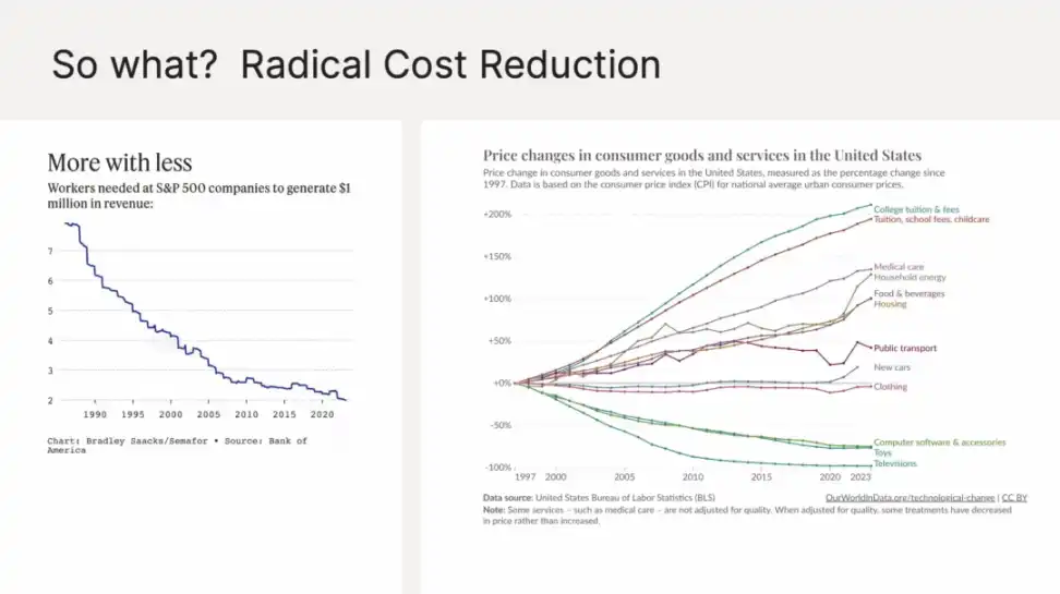 生产力革命对社会的影响是普遍和深远的。从经济学角度来说,这意味着成本能显著降低。上图显示 S&P 500 公司每 100 万收入所需的员工数量正在迅速下降,这种变化意味着我们将能以更快的速度和更少的人力来完成工作。但这并不意味着我们要做的事情变少了,而是在同样的时间能做更多的事。