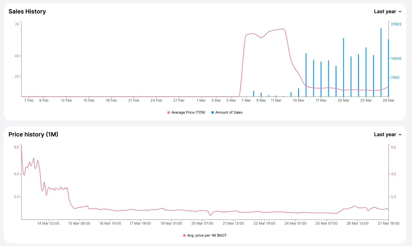 自 3.15 开始,Notcoin NFT 的交易量开始活跃, 25 日近期最高交易 2.5 万张,成交均价为 10 M= 6.7 TON,成交额为 83.75 万美元, 26 日交易 2.1 万张,成交均价为 10 M= 9.9 TON,成交额为 103.95 万美元。成交最高价出现在 3.13 日 10 M= 66 TON,最低价出现在 3.20 日 10 M= 3.7 TON。