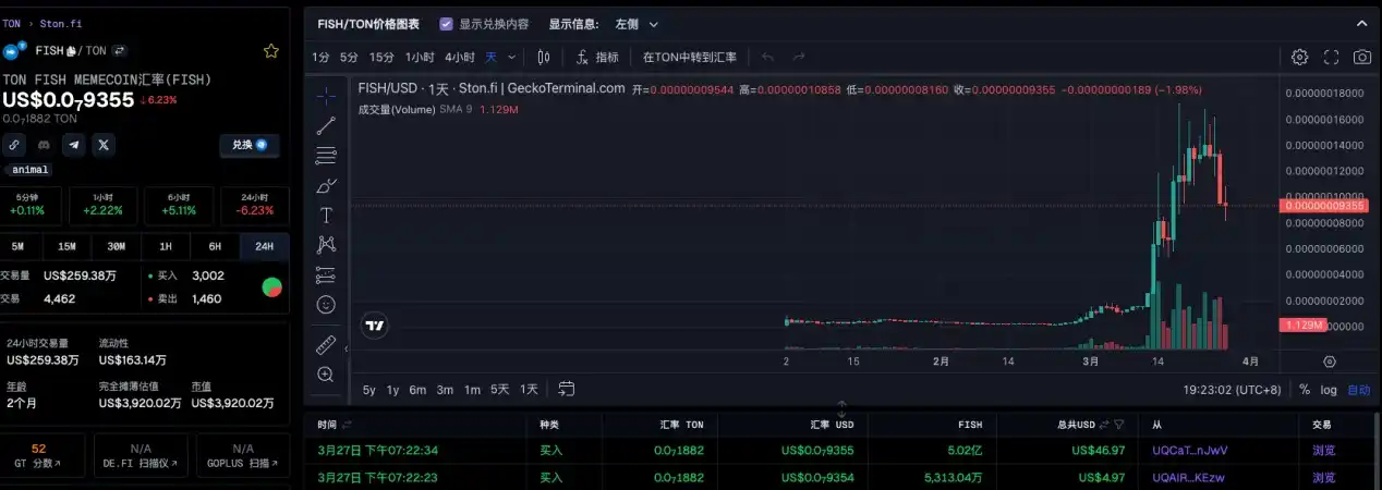 对比当前 TON 生态排名第一的 meme 币 FISH,其当前市值为 3900 万, 24 小时交易量为 255 万。Notcoin 在 NFT 交易阶段,市值和交易量约为 FISH 的 1/2.
